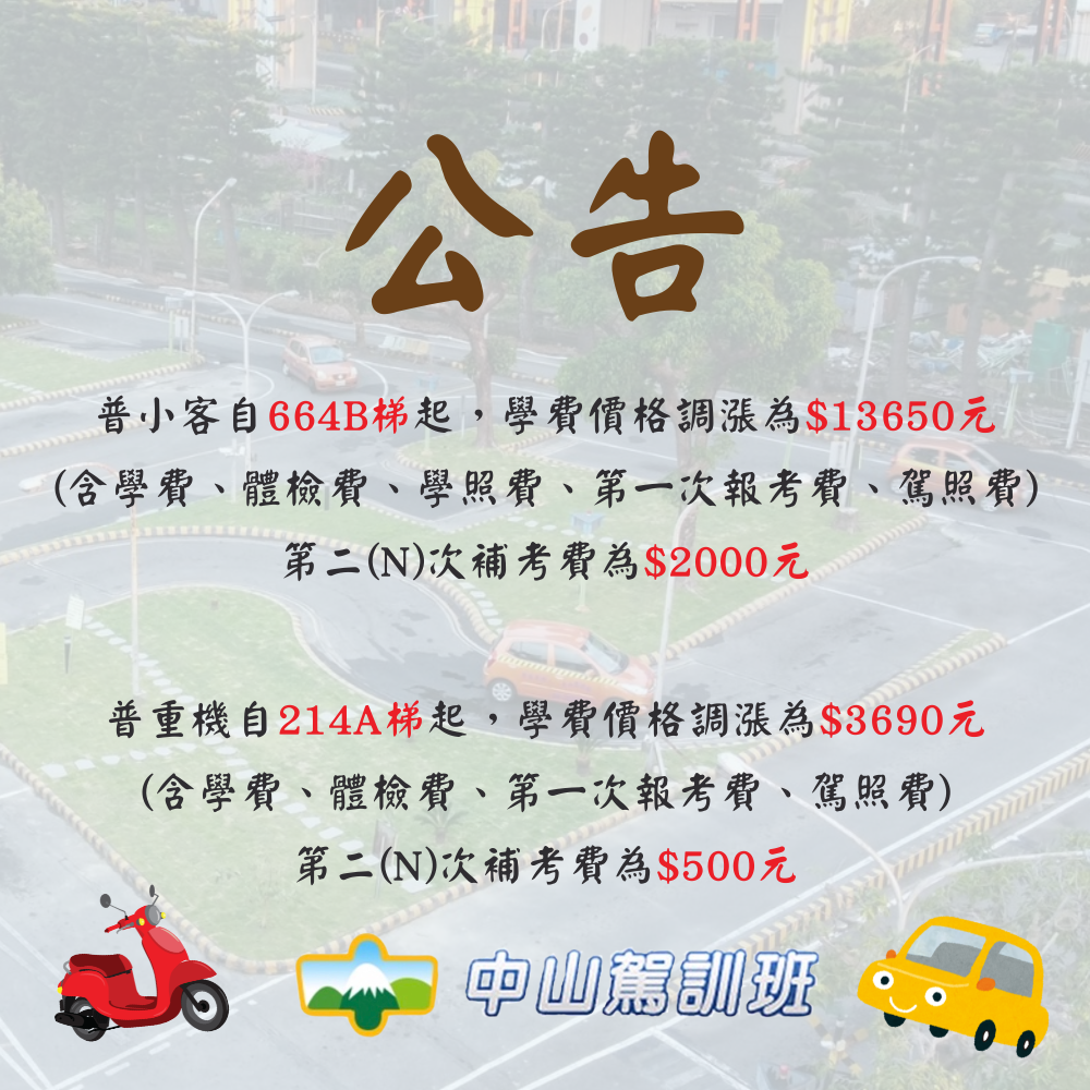 本班學費調整如下: 普通小客車(664B梯次起) 學費:11,500元 代辦費:2,150元(含體檢) 第二(N)次補考費:2,000元